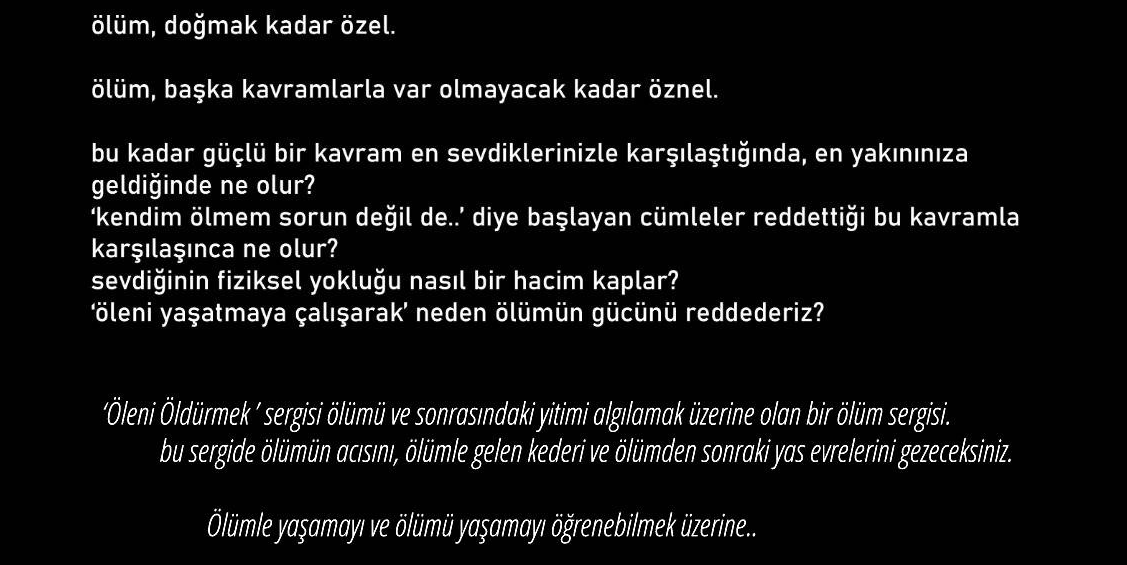 Proje İçeriği: Akbank Sanat bünyesinde gerçekleşen dijital sergi tasarımı projesidir. Sergi mekanı olarak Akbank Sanat kullanılmış, iki katta sergileme yapılmıştır. Sergide Öleni Öldürmek temasıyla Freud’un ölümden sonraki yas süreçleri yaklaşımı ele alınmıştır. Sergi ölüm anıyla başlar ve ölümden sonrası yas ı ele alır. Sergide 11 sanatçının resim, heykel, enstalasyon ve yansıtma-mapping yoluyla gösterimden oluşan 59 adet işi yer alır. Sergi kapsamında sergi tasarımı, sergi bütçesi, zaman çizelgesi, lojistik hizmetler, basılı bültenler planlamaları ve belgelemeleri yapılmıştır. Yayın haklarının saklı olmasından ötürü görsel paylaşılamamaktadır.